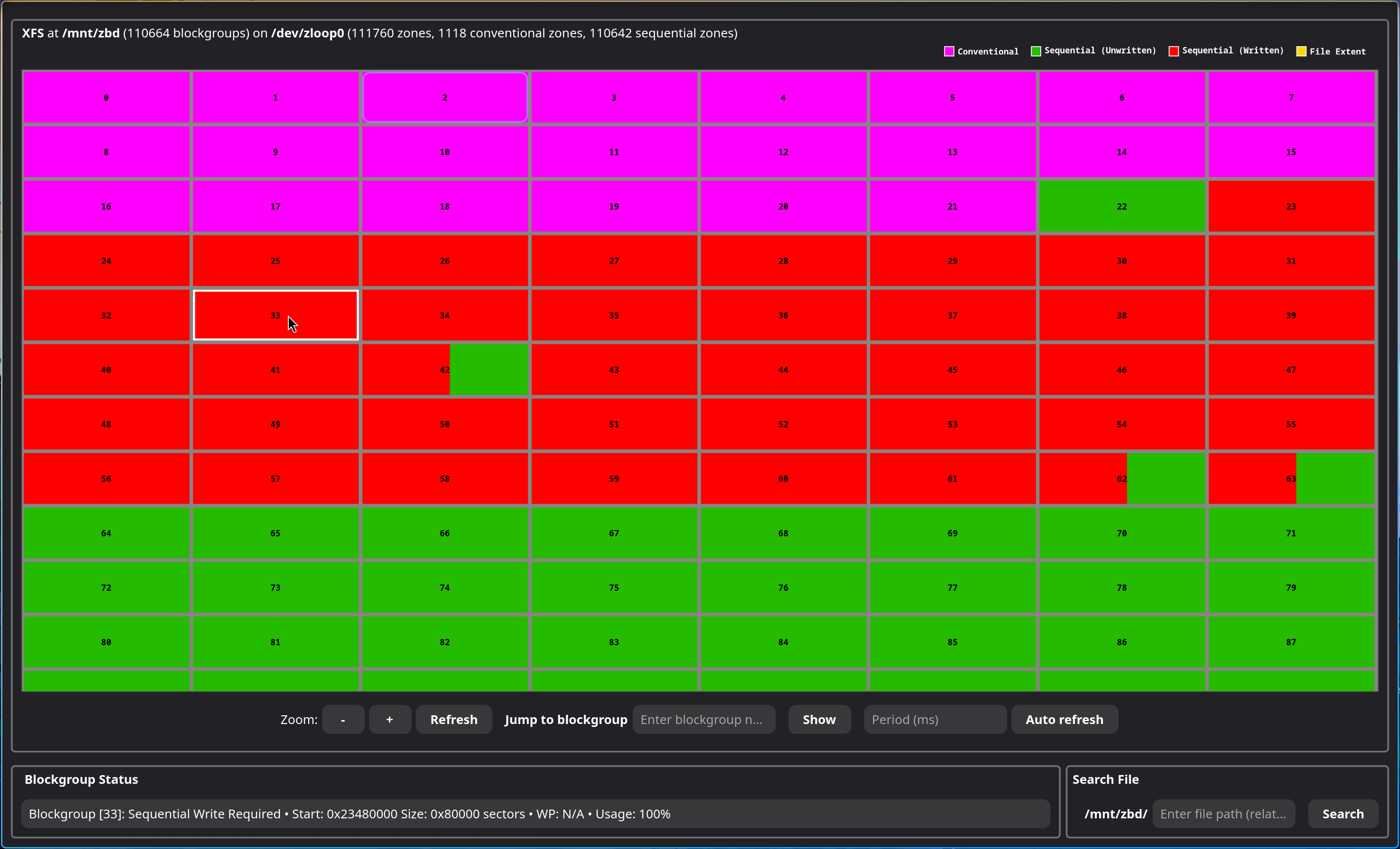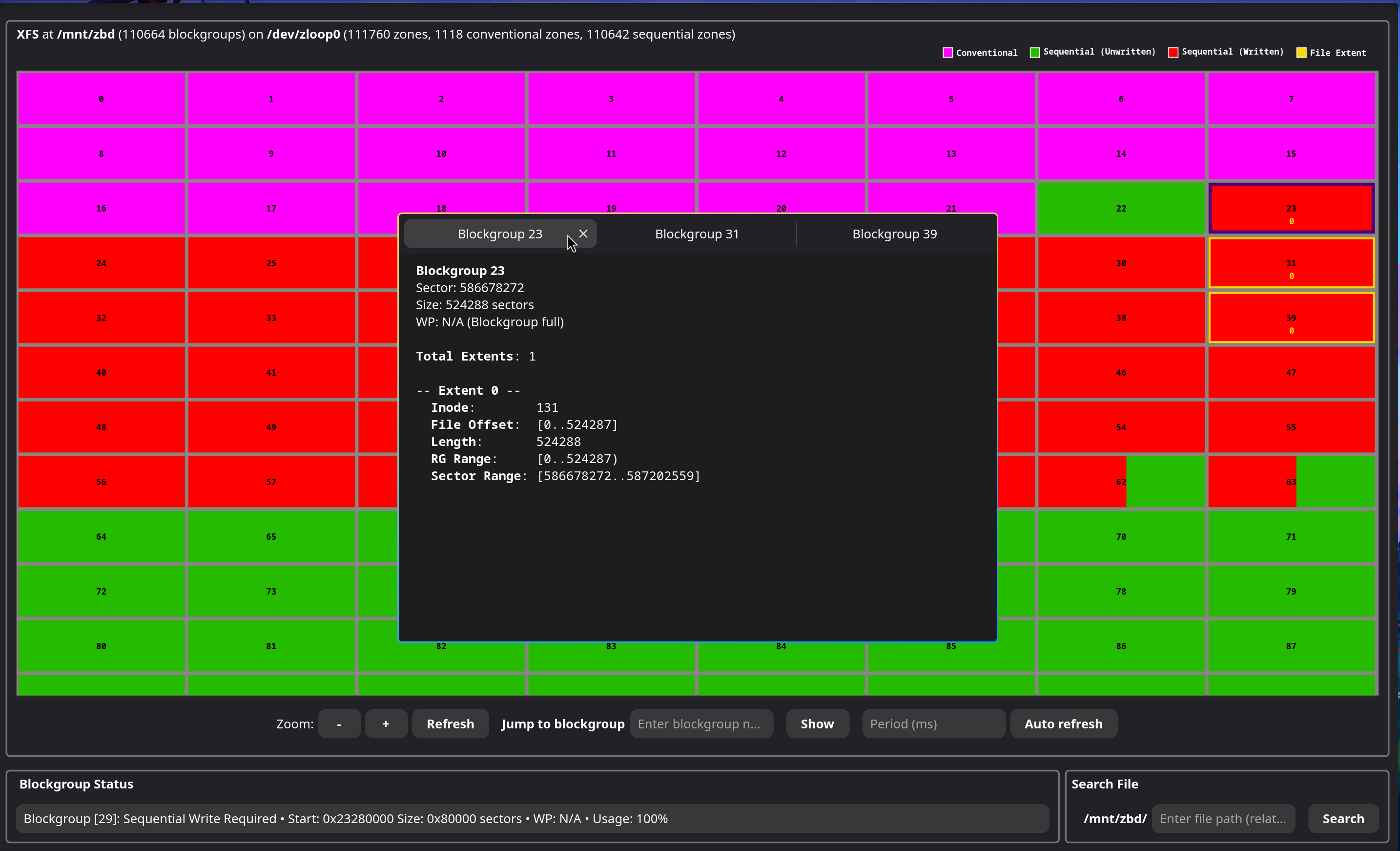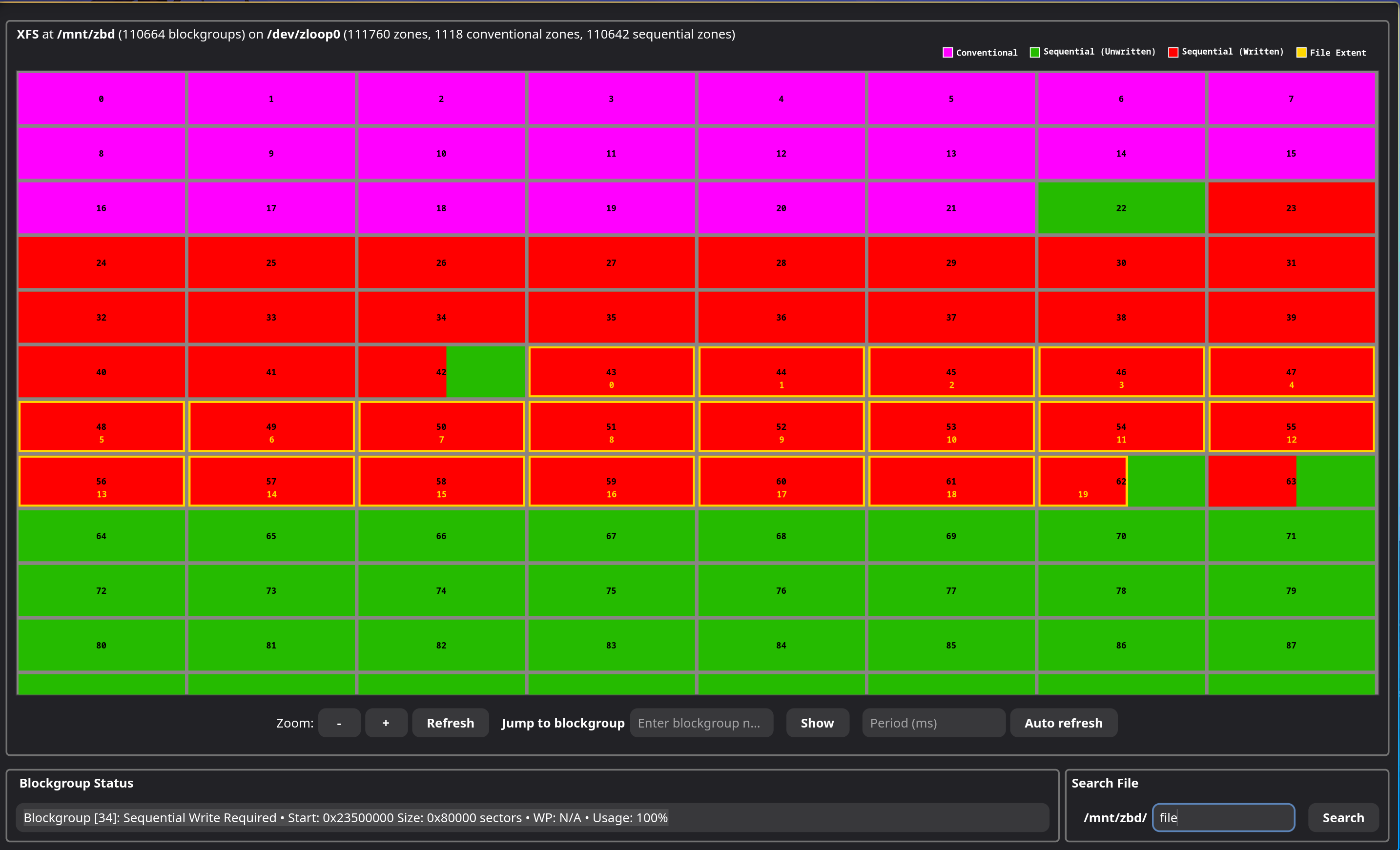 As per the screenshot above, at the very top Zonar shows the filesystem type (XFS), the mount location (/dev/zloop0) and the total number of zones (sequential and conventional). The legend for the scrollable blockgroup grid is also displayed here.